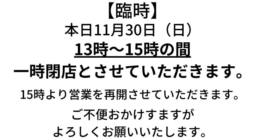 【臨時】本日11月30日(日)は13時~15時の間は休憩させていただきます。15時より再開