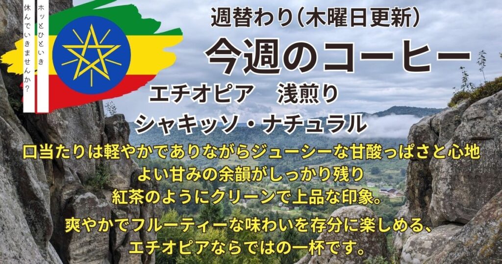 今週の週替わりコーヒーを更新いたしました。エチオピア産 グジ シャキッソ村 ナチュラル精製 浅煎りエチオピア南部グジの高地、標高およそ2,000mに位置するシャキッソ村。豊かな森と肥沃な赤土に恵まれスペシャルティコーヒーの名産地として高い評価... -