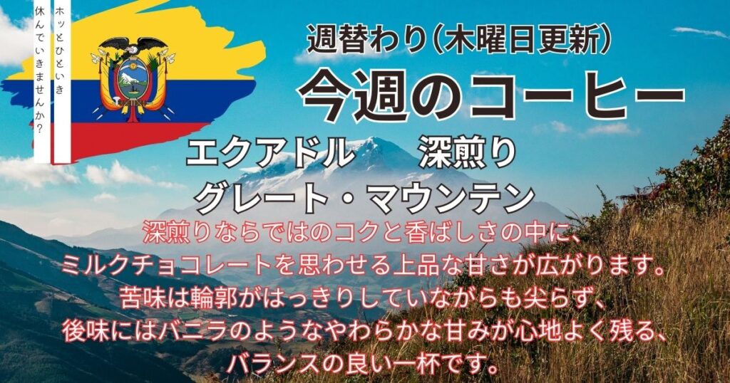 今週の週替わりコーヒーを更新いたしました。エクアドル産 グレート・マウンテン ウォッシュド製法 深煎りグレート・マウンテンは赤道直下に位置するエクアドルで育ったコーヒーを使用した深煎り仕上げの一杯です。エクアドルは年間を通して気温変化が... -